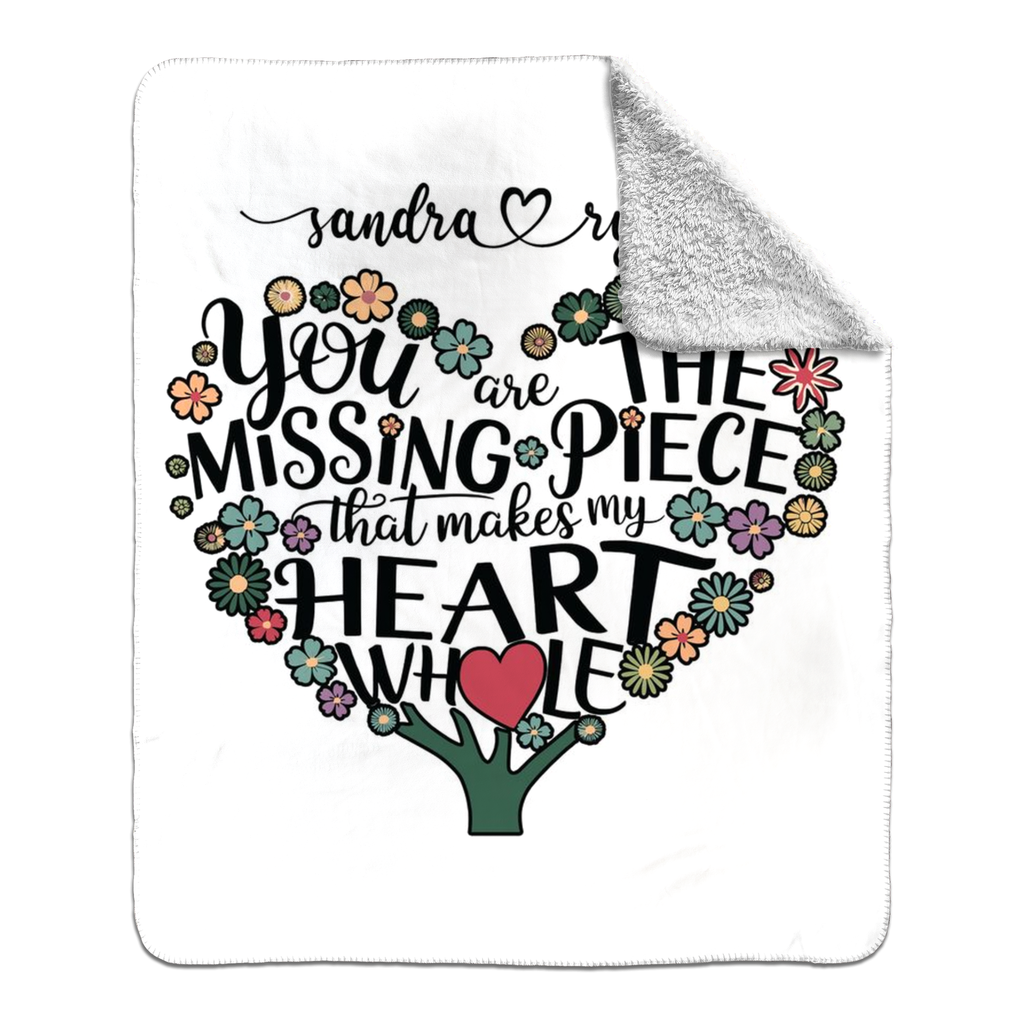 Wrap yourself in warmth and comfort with our cozy personalized ‘You Are The Missing Piece That Makes My Heart Whole’ Sherpa blanket. Soft, luxurious, and custom-designed just for you, it’s the perfect addition to your home or a thoughtful gift for someone special.